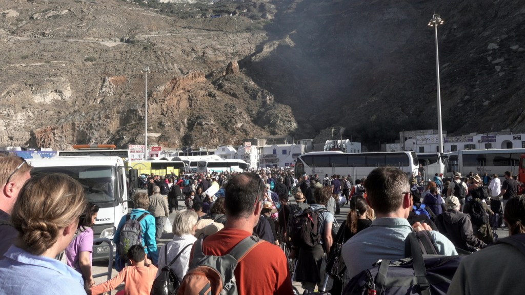 Une navette nous amène au port. Notre billet indique 16h40 comme départ, une recherche sur internet nous renseigne que le départ doit se faire à 17h30. La navette pour Héraklion (Crête) arrive finalement à 18h30. Il ne semble pas y avoir de poste d’information donc difficile vraiment de savoir ce qui se passe.