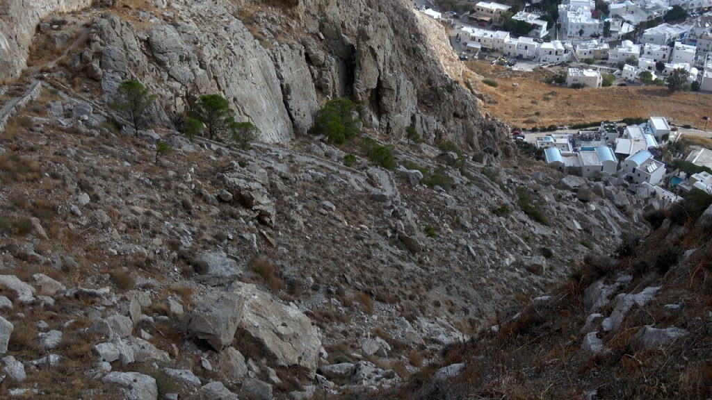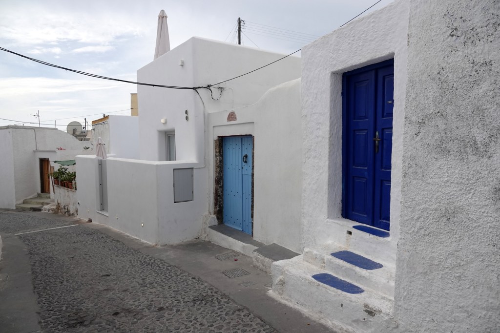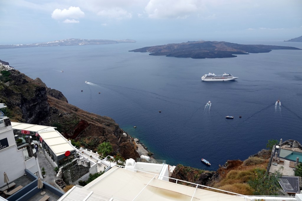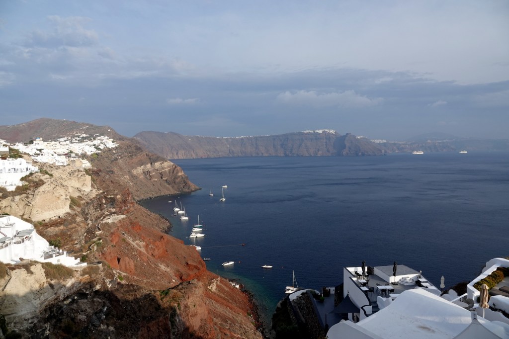 Aujourd’hui, nous nous levons et c’est nuageux, il a plu récemment. Nous décidons d’utiliser le transport en commun. Nous devons marcher 400 m pour nous rendre à la station d’autobus. On nous avait bien dit d’arriver d’avance. Nous sommes arrivés 20 minutes d’avance et l’autobus est arrivé et s’est remplie. Souvent durant ce voyage, nous nous sommes dit qu’en haute saison, ça devait être infernal. Cinq minutes plus tard, l’autobus était partie. Nous voilà en route pour Thira (Fira pour les touristes), c’est la capitale. Quelques pas plus tard, nous voilà dans le sentier des mules pour descendre au vieux port. C’est de là que se fait la plupart des tours de bateaux vers les îles voisines et c’est aussi à cet endroit que se fait l’arrivée des navettes des navires de croisière. Mais nous décidons de remonter en cable car.