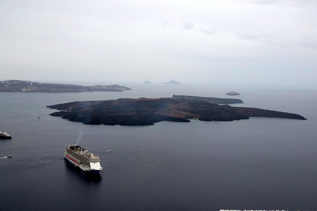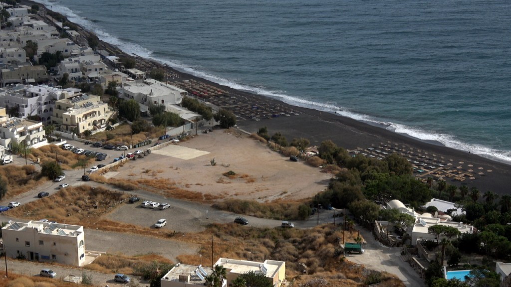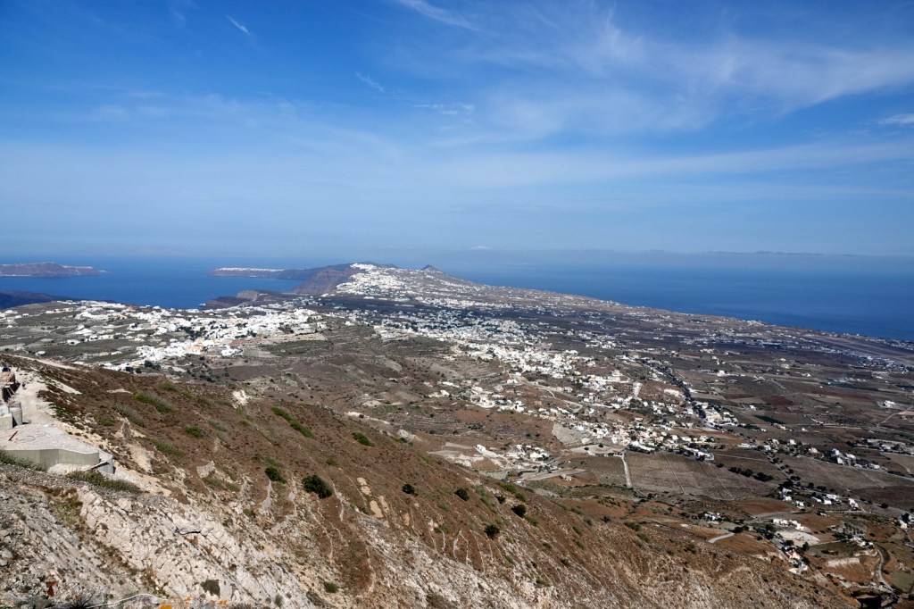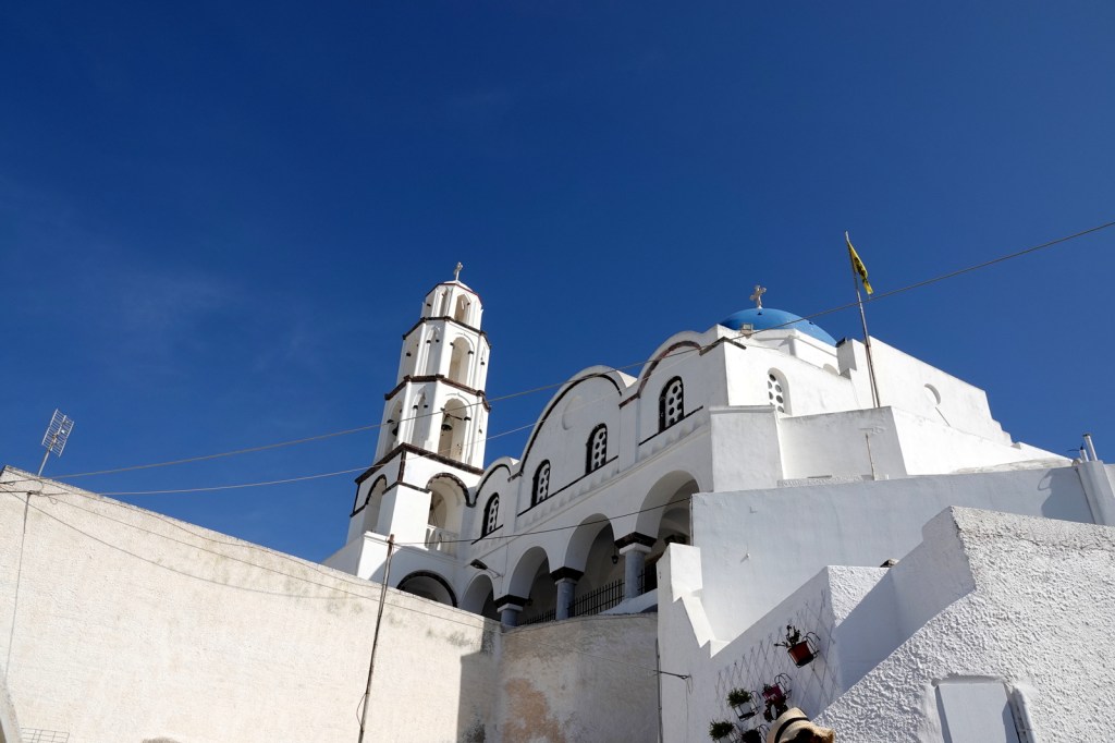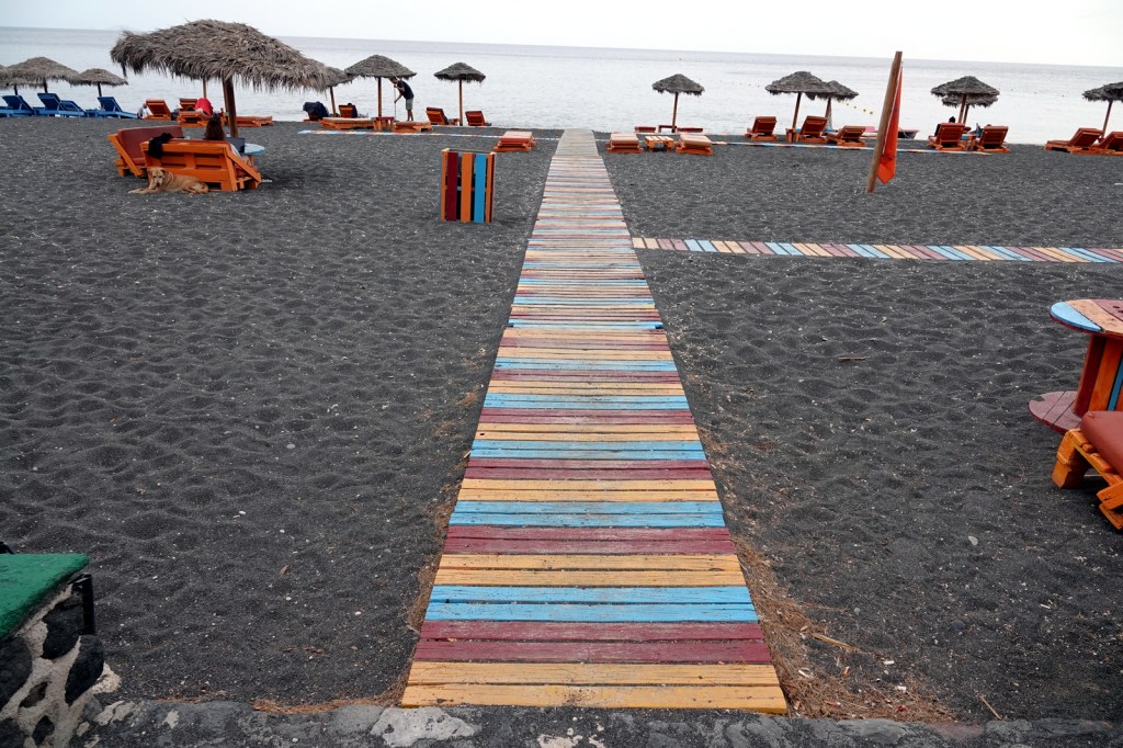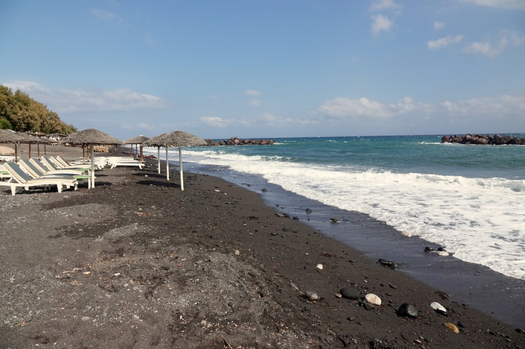 La météo module nos activités. Nous avons pris un tour de l’île. Une façon rapide de voir les points principaux de l’île. Premier arrêt, l’endroit le plus élevé de Santorin : Moni Profiti Ilia. Une vue superbe sur la Caldéra (falaise formée par le cône du volcan qui s’écroule dans la mer) et en prime une petite chapelle. Cette visite fut suivie de celle d’une cité médiévale Pyrgos du temps des Vénitiens. On a encore droit à une magnifique vue sur Oia (la ville du bout de l’île). Lors de la 3ieme arrête dans la ville de Megalochiri, la guide nous parle des vignes et de leur forme à cause des vents et du manque d’eau. Le repas du midi se fait sur une plage de sable noir : Perissa Beach. Un sable volcanique qui peut devenir très chaud sous le soleil d’été.
