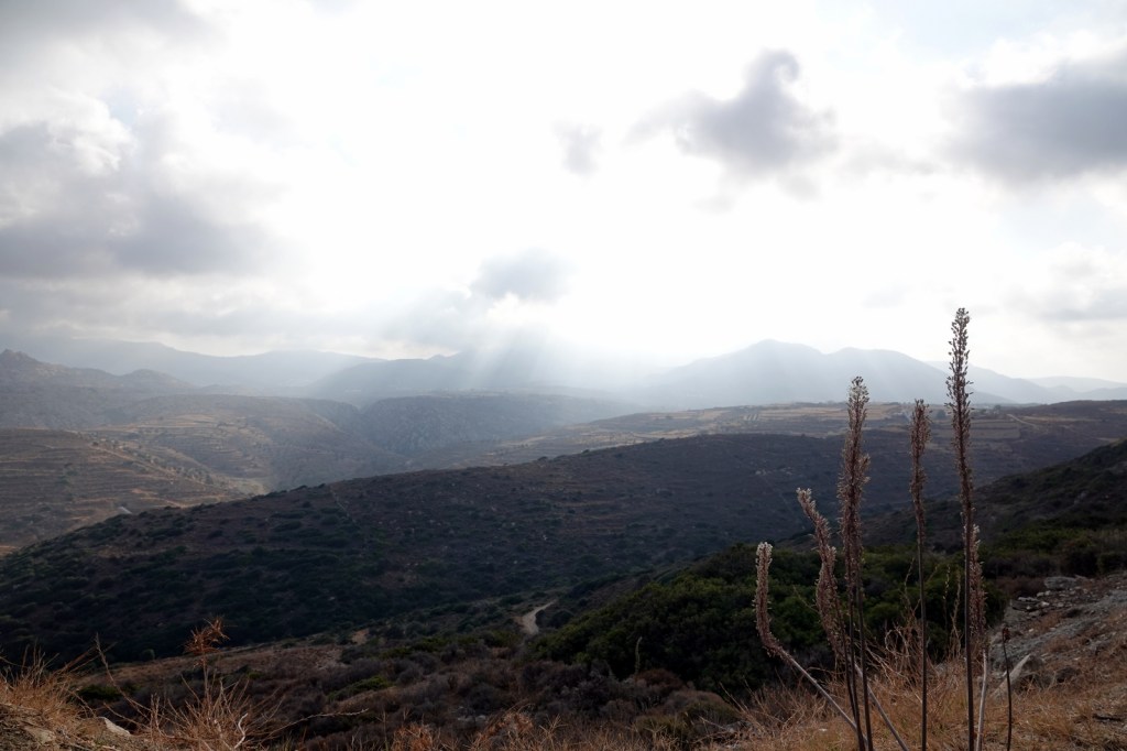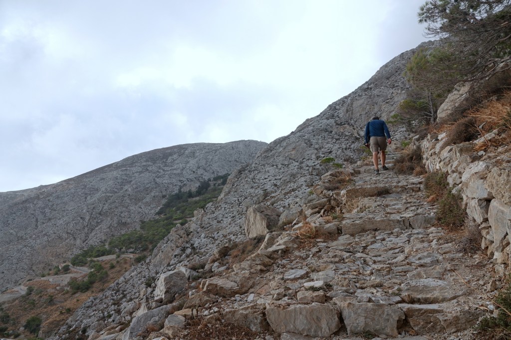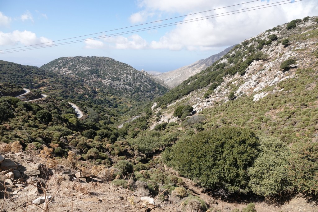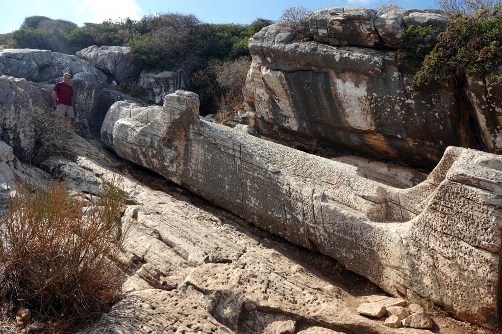 Puis, nous partons à la chasse du Kouros. La distance ne détermine pas le temps de déplacement. Monter, descendre, tourner à gauche, tourner à droite, accélérer, freiner et surtout être attentif aux autos que nous croisons. Heureusement, la route montagnarde fût agrémentée de nombreux arrêts pour apprécier les panoramas à couper le souffle. Après quelques heures de louvoiement, nous arrivons à l’endroit où le Kouros, la statue de 10.5 m, gît sur le sol depuis des siècles.