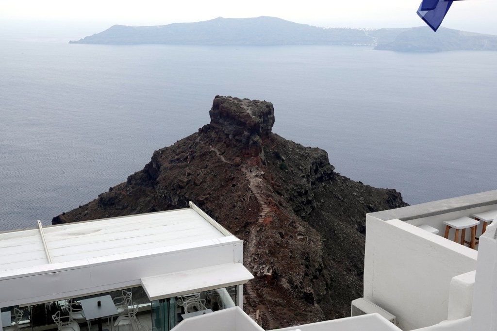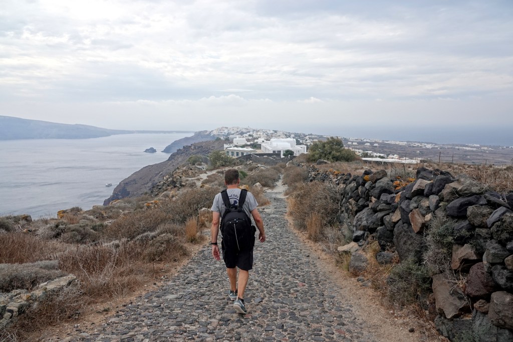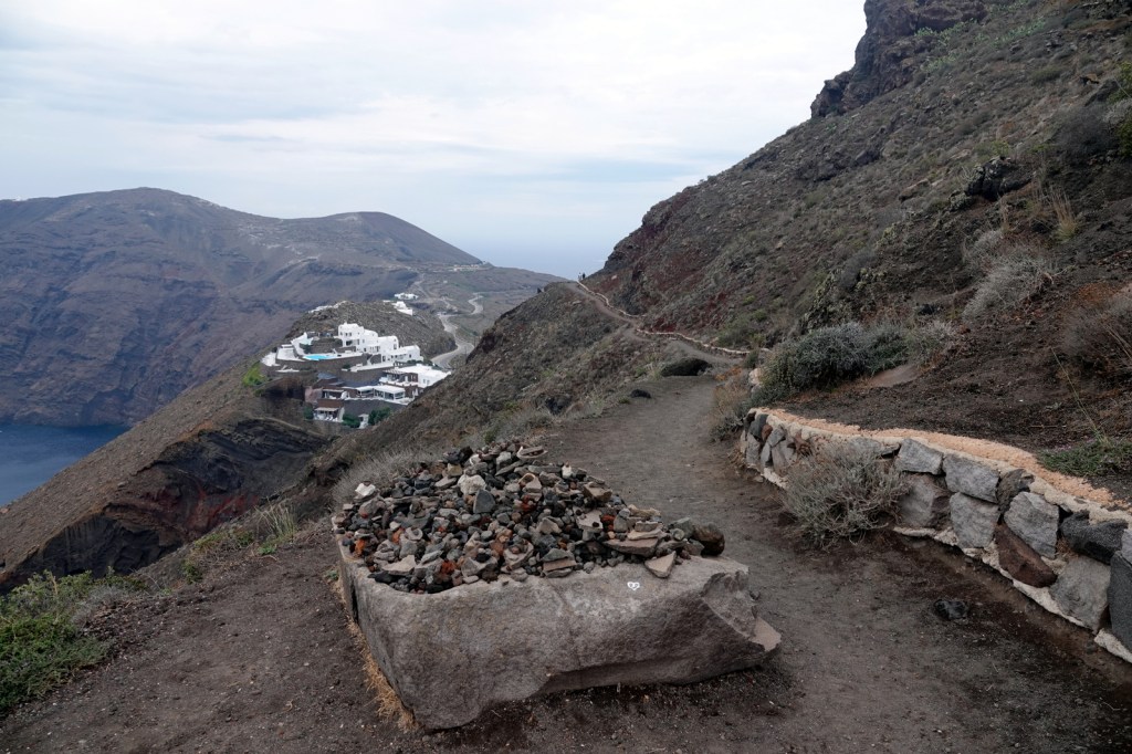 Tiens en passant à côtéOn n’en fera pas une photo Instagram. À bien y penser, c’est un île volcanique au loin. On descend le sentier des mules.On nous offre de descendre pour 10 Euros, si j’avais à choisir, ce serait pour monterBeaucoup de marches souvent inclinées et mouillées avec parfois des cadeaux laissés par les mules.Un arrêt photo en descendantJe crois que l’on va prendre le cable car pour remonterBateau typique sur lequel on peut se rendre sur l’île volcaniqueCertaines personnes ajustent la suspension de leurs autos, d’autres c’est leurs souliers. Ça lui permet de grandir de quelques centimètres.Nous avons commencé le sentier, il ne reste que 9.9 km à faireLa ville de Fira vu au loin.On peut faire une incartade. Bien involontairement, on s’est trompé de chemin et on s’est retrouvé à la base. Le Skaros rock est aussi une randonnée populaire.Tout au bout Oia, notre destination.Il semble que les gens déposent une petite pierre ici.Le trou d’un troglodyte, une genre des cavernes servant de résidence jadisCe sont des cavernes construites dans de la terre très friables.Oia est à horizon, encore quelques kms.Le sentiers changent le long de la randonnée: pavée, pierres, sable… il y en a pour tous les gouts. Il faut être prudent.Encore une file Instagram pour photographier le dôme bleu. Vu d’un autre angle. C’est la cohue…,, Le soleil se couche tout doucement. L’énergie de la ville provient de tous ces gens qui se promènent dans les rues et des merveilleux points de vue.Ça nous semble l’endroit utiliser pour les shooting photosUn café à Oia avec vue sur les dômes bleus quoi demander de mieuxVue vers Imerovigli et le Skaros RockUne photo près du point de que tous les fans d’Instagram se rassemblent.