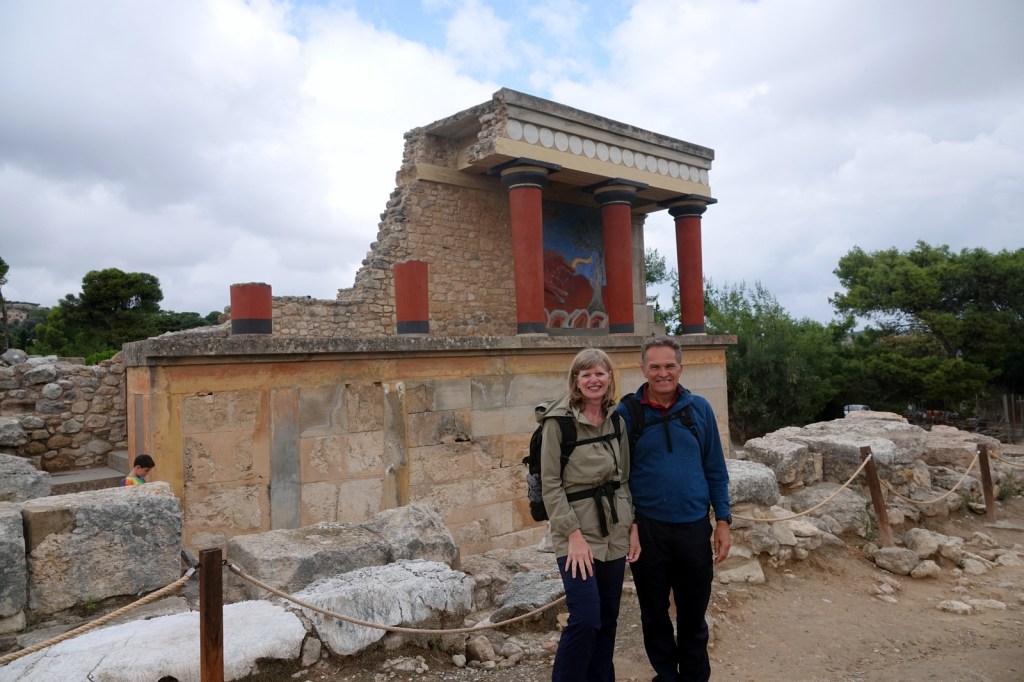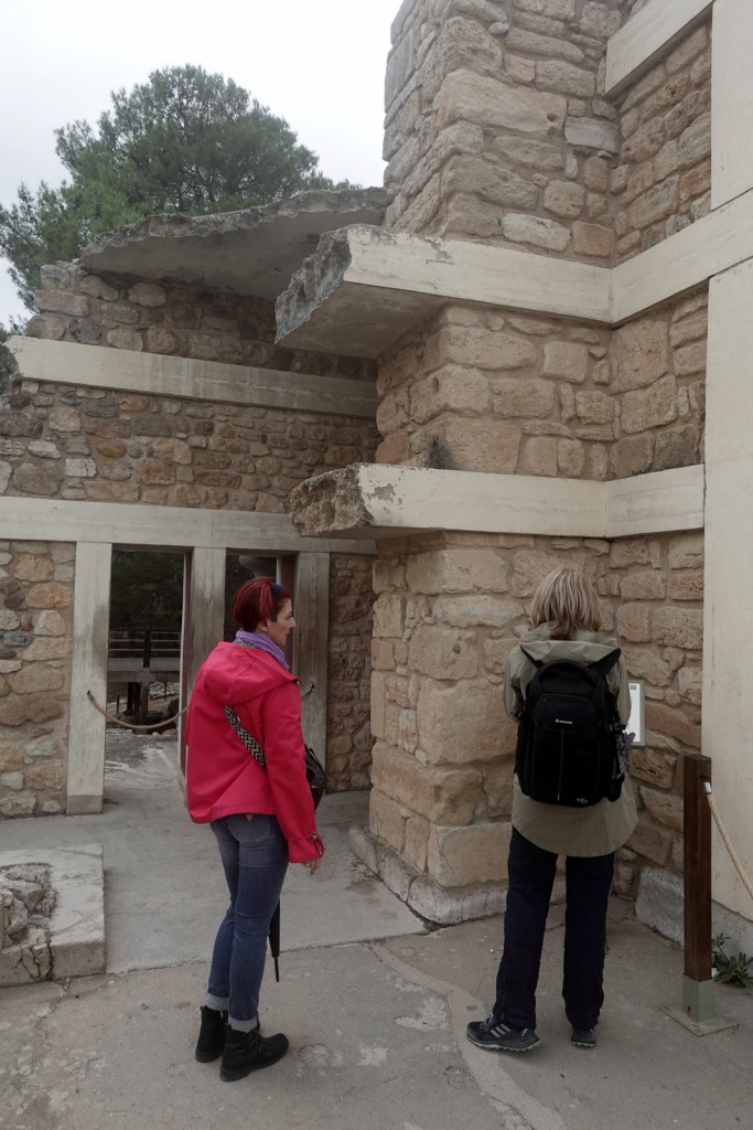 Une nouvelle ville, de nouveaux repaires sont nécessaires. Nous voulons visiter le palais de Knossos, il s’agit d’un site archéologique très important dans la région, mais nous dévons nous y rendre, il est environ à 6 km de la ville. Nous choisissons le transport en commun. L’autobus # 2 s’y rend mais nous devons trouver ce bus. De plus, nous devions rencontrer notre guide pour 11h00 ayant réserver ce tour en français tôt le matin. Difficile d’avoir de l’information, mais nous suivons les indications du téléphone et se retrouvons sur le bon bus qui était bondé de touristes allant au même endroit. Selon notre guide, c’est le 2ieme site le plus visité après l’Acropole d’Athènes.
