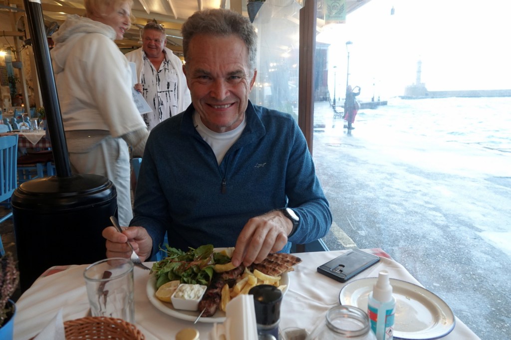 Nous voulons prendre un autobus qui fait le tour de la ville de Chania, nous nous trompons d’endroit. Nous allons au jardin botanique : fermé pour rénovation. Nous trouvons un endroit ou l’autobus passe et il ne passe pas. Bref, nous courrions derrière notre ombre. La température s’en mêle et il tombe un petit crachin. Nous décidons de visiter le musée maritime, un musée composé principalement de maquettes. Après le dîner, nous décidons d’aller voir la plage, par curiosité. Nous tombons par hasard sur le départ des autobus tant recherchés. Nous décidons de faire le tour de ville, au cas où. Nous n’avons pas été déçu, nous avons découvert des endroits dont nous ne connaissions pas. De plus, nous avons enrichi nos connaissances sur l’histoire de la Crète. Tout est bien, qui finit bien. La Crète est un peu différente de la Grèce. Nous n’avons pas encore tout saisi ces différences, mais il y a un petit quelque chose : certains restaurants nous donnent l’addition au début (à Athènes aussi), nous avons remarqué que les gens avaient beaucoup plus de chiens… Il faut surement un certain temps pour tout saisir. Bref, nous avons apprécié notre séjour, mais nous aurions aussi aimé visiter la Crète moins urbaine, plus naturelle. Petit fait cocasse, notre dernier repas en Crète fut au même endroit que le premier, mais cette fois nous étions à l’extérieur, sur la terrasse près du bord de la mer.