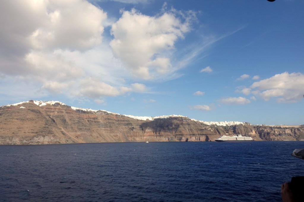 Une marche le long de la plage avant le transport au port. Nous partons pour Santorini. Pour la première fois, le traversier était en retard. L’arrivée à Santorini nous impressionne. La caldera avec ses maisons bâties tout en haut. L’hôtel se trouve de l’autre côté de l’île près d’une plage. Les prévisions nuageuses s’annoncent nuageuse et possiblement pluvieuse pour samedi, à suivre.