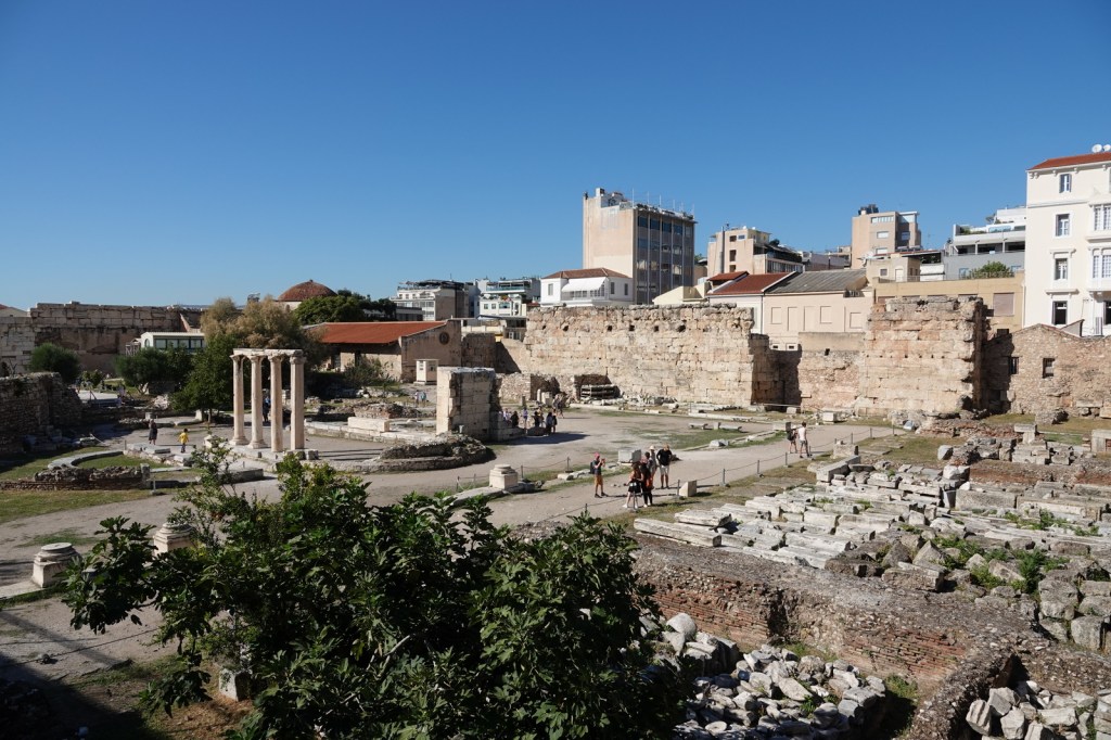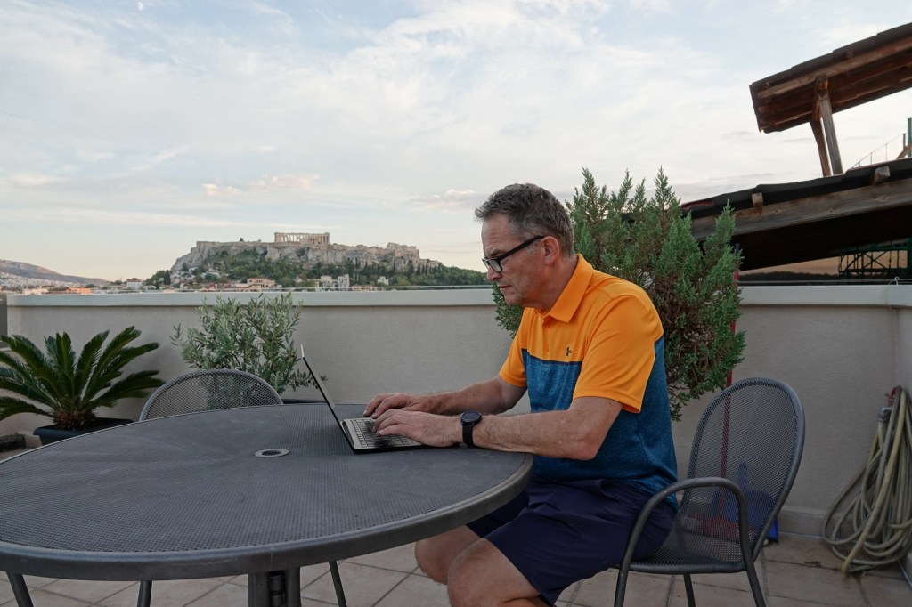 Les nuits sont courtes vers l’Europe, le truc c’est de dormir dans l’avion et ne pas dormir en arrivant à l’hôtel. Par chance, un chauffeur de l’agence Wingbuddy nous attendait pour nous conduire à l’hôtel au centre d’Athènes. Nous estimons le trajet à environ 30 minutes. En arrivant, nous montons sur le toit pour admirer l’Acropole. Une vue exceptionnelle sous un soleil de plomb. Nous anticipons déjà la vue à la tombée de la nuit.