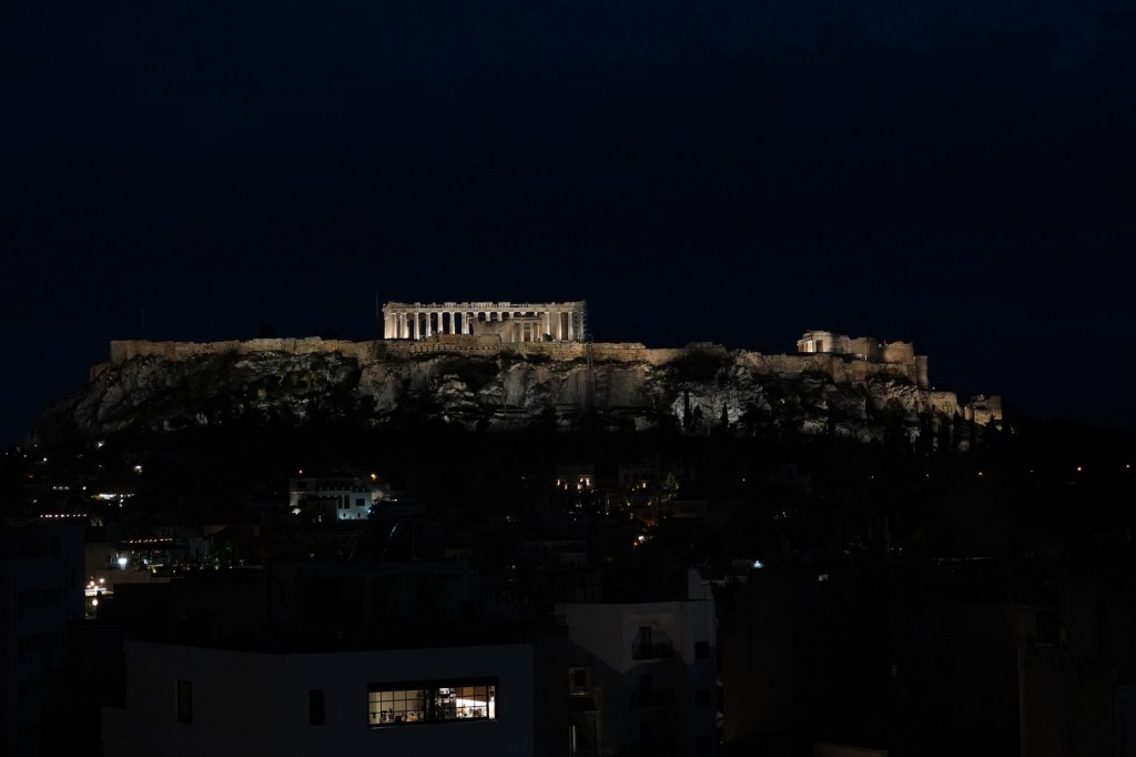 Il fallait faire le pont entre le souper et le coucher du soleil et surtout ne pas fermer l’oeil. Un petit effort avant de se vautrer dans ces draps qui nous tendent la main depuis le midi. Nous participons au grand rituel de la soirée qui consiste à gravir les marches qui nous sépare du toit pour diriger nos regards et nos caméras vers l’Acropole qui se dresse au cœur d’Athènes depuis des millénaires. Ce sera de courte durée car nous quittons l’hôtel à 5h30 demain matin.