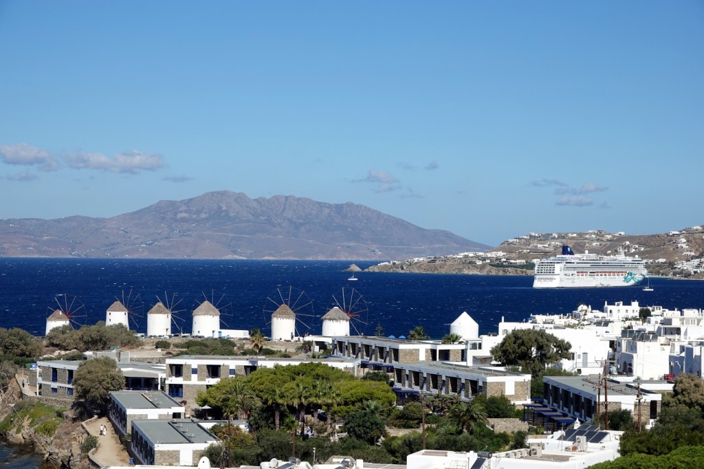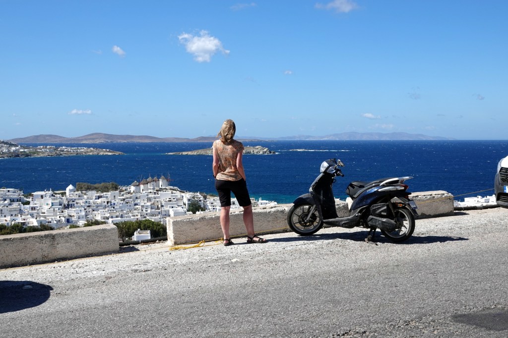 Nous étions ambivalents : risque de pluie pour demain ? Impossible. Nous suivons l’horaire prévu. Nous décidons de louer une auto. Je demande la moins chère possible, c’est ce que j’ai eu. Je croyais que ce serait plus difficile de conduire à Mykonos, ce n’est pas si pire, il faut être attentif lorsque nous rencontrons dans les chemins étroits et faire attention au moped, quads, autos et autobus. Il faut avoir une vision 360.