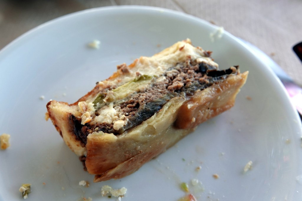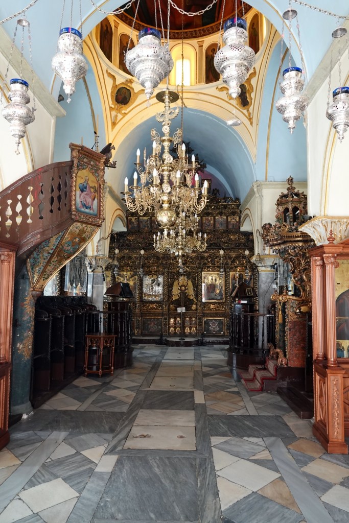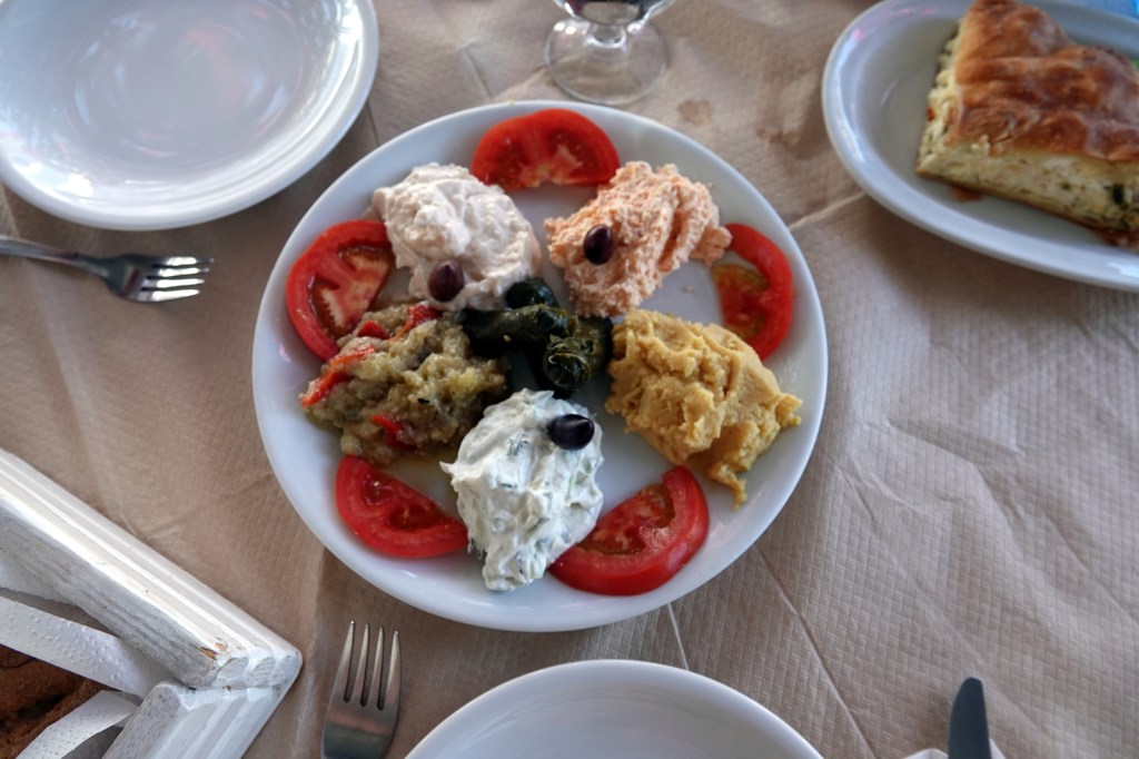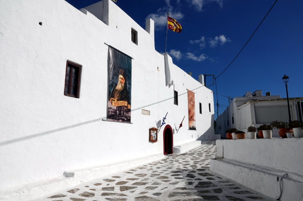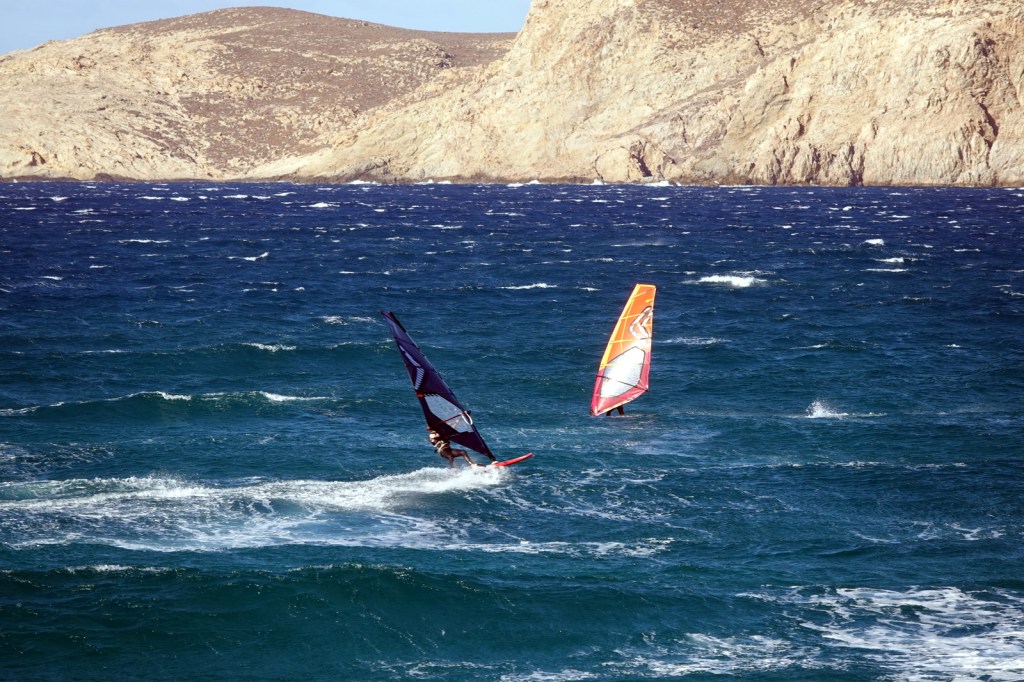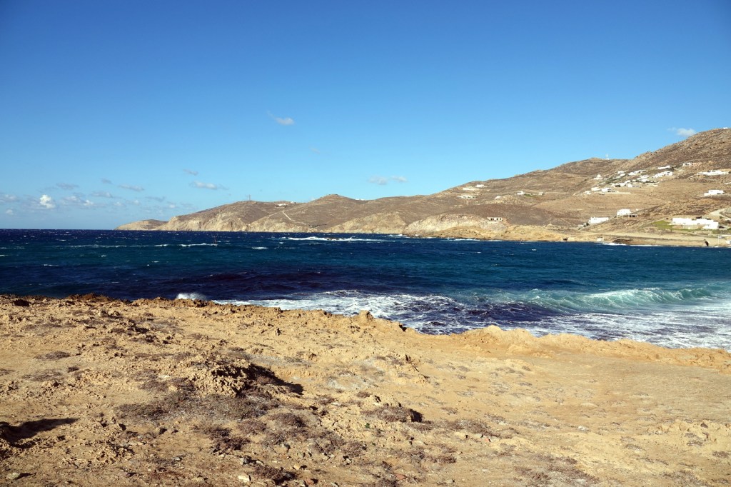 Après une courte visite dans la ville principale, nous nous dirigeons vers le phare au bout de l’île. Une route tortueuse et étroite nous y conduit. Le climat est plutôt désertique, le phare attire quelques touristes audacieux et présentent de beaux panoramas si vous passez par là. Deuxième arrêt, le village de Ano Mera, c’est un village calme et authentique dont l’atmosphère tranquille contraste avec celui de la ville principale. Nous choisissons un restaurant grec avec des mets traditionnels : une entrée au nom imprononçable, une tarte aux oignons et une moussaka. Le palais s’habitue lentement mais pas pour les olives. La route nous conduit à une plage tout près. Le vent souffle vigoureusement depuis notre arrivée au grand plaisir des véliplanchistes.