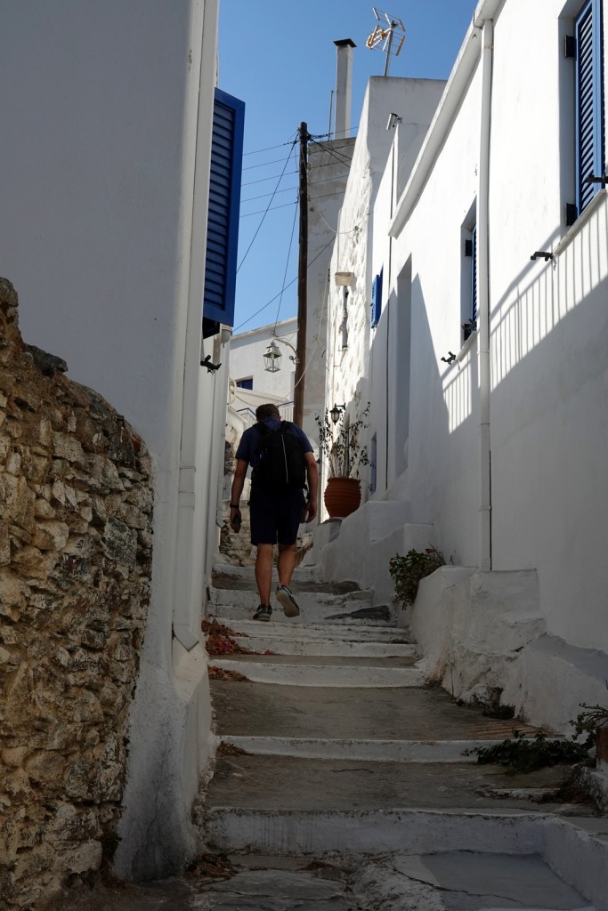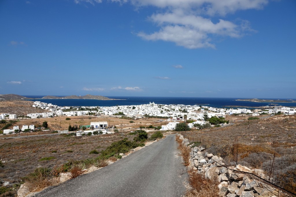 Notre estomac nous a incité à revenir à Naoussa pour savourer un Gyros grecs. La route nous amène à Lefkes. Une petite ville du centre de l’île qui se retrouve dans la partie la plus verdoyante de Paros (ne vous attendez pas à des grands champs vert). La partie centrale est plutôt piétonnière seuls les résidents savent se promener dans les dédales de la ville pour y stationner leur auto. Telle une chèvre, nous nous sommes stationnés dans la partie haute où se trouvait un stationnement public. Escaliers et ruelles nous mènent à l’Énorme Cathédrale qui trône fièrement autour de nombreux oliviers.