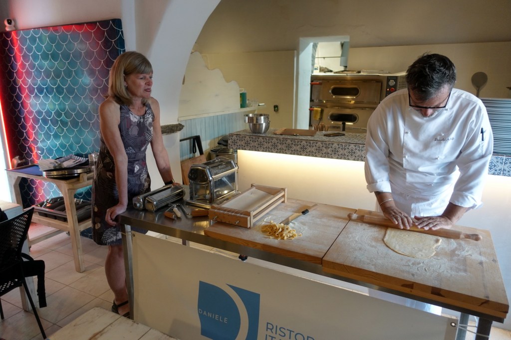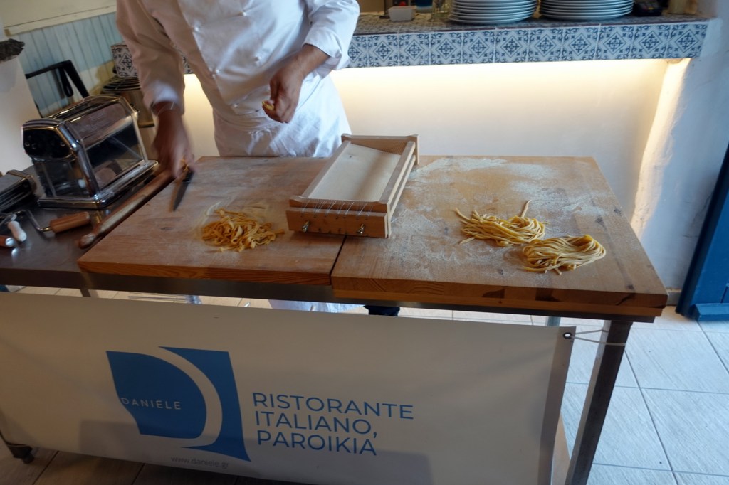 Le soir, nous avions rendez-vous avec un chef italien Daniele Astolfi qui est venu s’installer à Paros pour son amour de l’île, Il nous a donné une entrevue dans son restaurant Daniele tout en fabriquant des pâtes à la main. Ce fût suivi de l’un des meilleurs repas italiens que nous ayons dégusté constituer de plat de dégustation : tartare, risotto et pâtes diverses. Un délice.