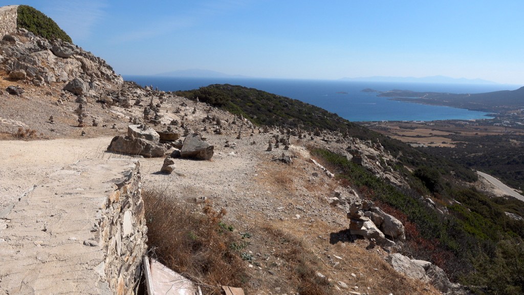 Nous découvrons que la route Byzantine est tout près : le plus vieux sentier pédestre de l’île d’une longueur de plus de 3 km. L’histoire et les vues spectaculaires se marient lors de notre randonnée. Mais le temps nous pousse. L’église aux Cent Portes nous attend, il s’agit de l’un des monuments paléochrétiens les plus importants en terre grecque. 99 portes sont visibles, selon la légende, la centième sera découverte quand Constantinople (Istanbul) sera grecque.