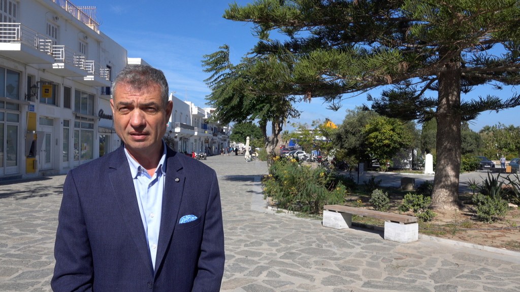 Nous avons quelques heures à tuer avant notre rencontre avec le maire à 11h00. Oui, oui, le maire. Le chef italien Daniele nous a planifié une entrevue hier soir. Entretemps, nous décidons de refaire le parcours d’hier : la plage de Kolimpithres et Naoussa. La température est plus clémente et le vent est tombé. Nous sommes arrivés tout juste à l’heure pour rencontrer le maire, car nous étions à l’heure de départ d’un traversier. C’est toujours la cohue dans cette période et les stationnements sont presque impossible à trouver. Il a eu la gentillesse de nous parler avec motivation (en grec) des attraits de Paros.