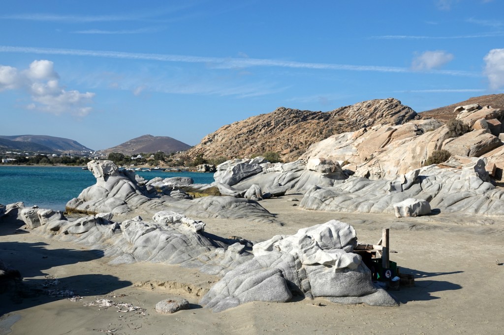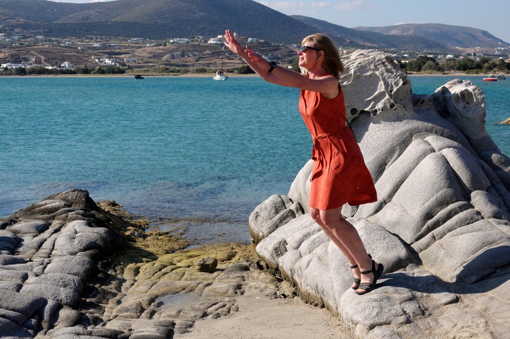 Puis, la plage de Kolimbithres nous interpelle. Le vent a éloigné les baigneurs, la plage était presque vide. Il ne s’agit d’une plage mais plutôt de nombreuses petites plages séparées par des formations rocheuses. Ces masses de granit ont été sculptés par l’eau et le vent depuis des millénaires. Pour plusieurs, il s’agirait de la plus belle plage de Grèce. Nous y sommes allés par curiosité et nous y sommes restés par enchantement. Par moment, nous nous croyions dans le décor des Pierrafeu.