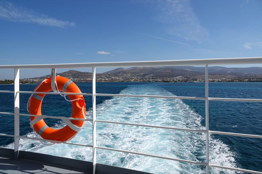 Nous commençons à prendre le rythme des îles : lever tardif, cappuccino pour le déjeuner, marche sur la plage. La navette nous attend à 11h30 pour le port. Le rythme endiablé recommence suite au vent d’hier (nous croyons), des milliers de personnes attendent avec impatience le traversier pour Paros, Naxos, Ios et Santorini. Il y a du monde partout. Le traversier devrait partir à 13h00. Il arrive à 12h35, les gens descendent, suivi des motos et des autos. Puis les autos montent. Les gens sont impatients, il n’y a pas vraiment de ligne. Dix minutes, les gens montent, les valises s’entrechoquent, une marée humaine monte dans le navire. À 13h00 (à ma grande surprise), tout le monde est dans le bateau, la porte est refermée et le bateau est parti. Il y a des valises partout sur les bords du navire. On vérifie notre billet et on se trouve un banc (à ma grande surprise) pour la traversée qui doit durer 1h30.