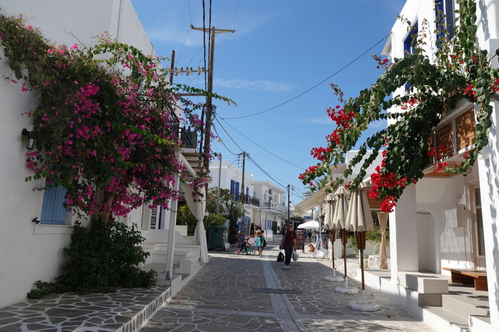 À notre arrivée à Paros, l’atmosphère est différente. L’endroit nous apparaît plus serein. Le contraste est marquant. Notre hôtel légèrement à l’extérieur de la ville est rustique mais l’accueil est chaleureux. Nous discutons avec des québécois qui nous décrivent l’endroit comme étant plus authentique. Nous n’avons pas eu vraiment le temps de s’imprégner de l’endroit. Notre balade au centre-ville confirme le tout : les gens sont chaleureux et ouverts. Les ruelles s’harmonisent avec l’authencité de la ville. Un arrêt dans un resto local nous fait goûter à la cuisine grecque authentique. Un délice. Paros nous a conquis.