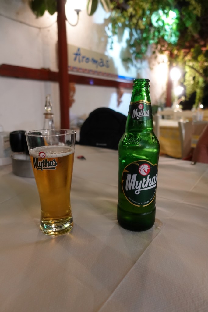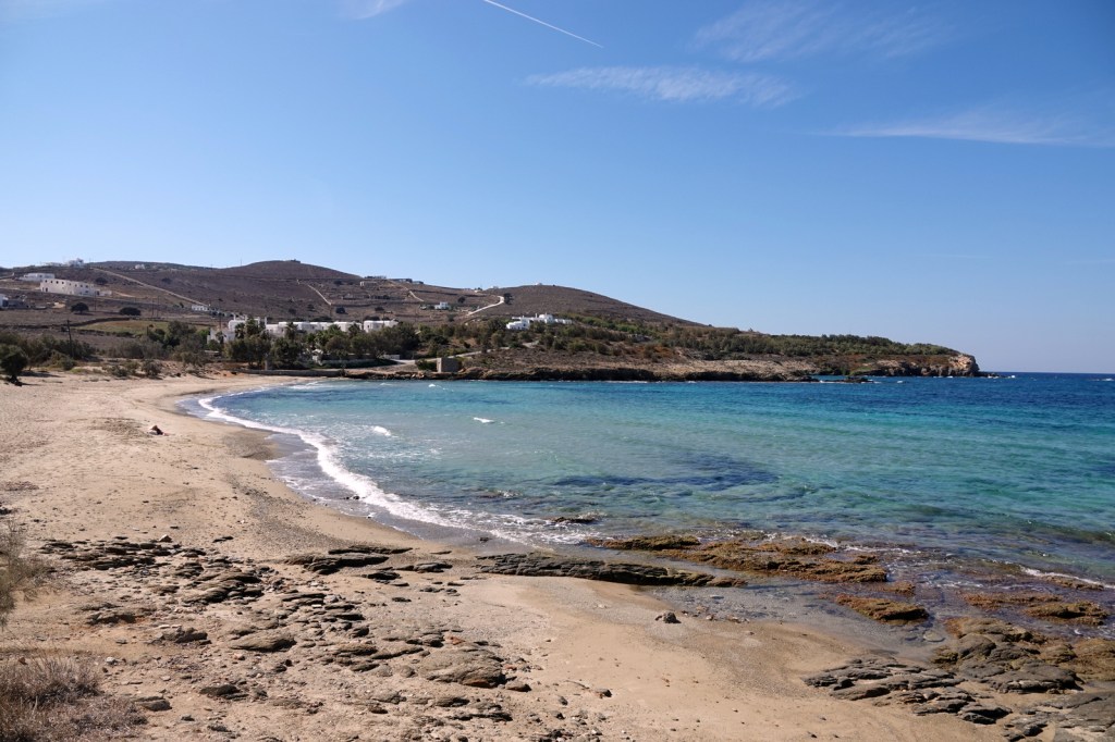 Après une courte visite dans la ville principale, nous nous dirigeons vers le phare au bout de l’île. Une route tortueuse et étroite nous y conduit. Le climat est plutôt désertique, le phare attire quelques touristes audacieux et présentent de beaux panoramas si vous passez par là. Deuxième arrêt, le village de Ano Mera, c’est un village calme et authentique dont l’atmosphère tranquille contraste avec celui de la ville principale. Nous choisissons un restaurant grec avec des mets traditionnels : une entrée au nom imprononçable, une tarte aux oignons et une moussaka. Le palais s’habitue lentement mais pas pour les olives. La route nous conduit à une plage tout près. Le vent souffle vigoureusement depuis notre arrivée au grand plaisir des véliplanchistes.