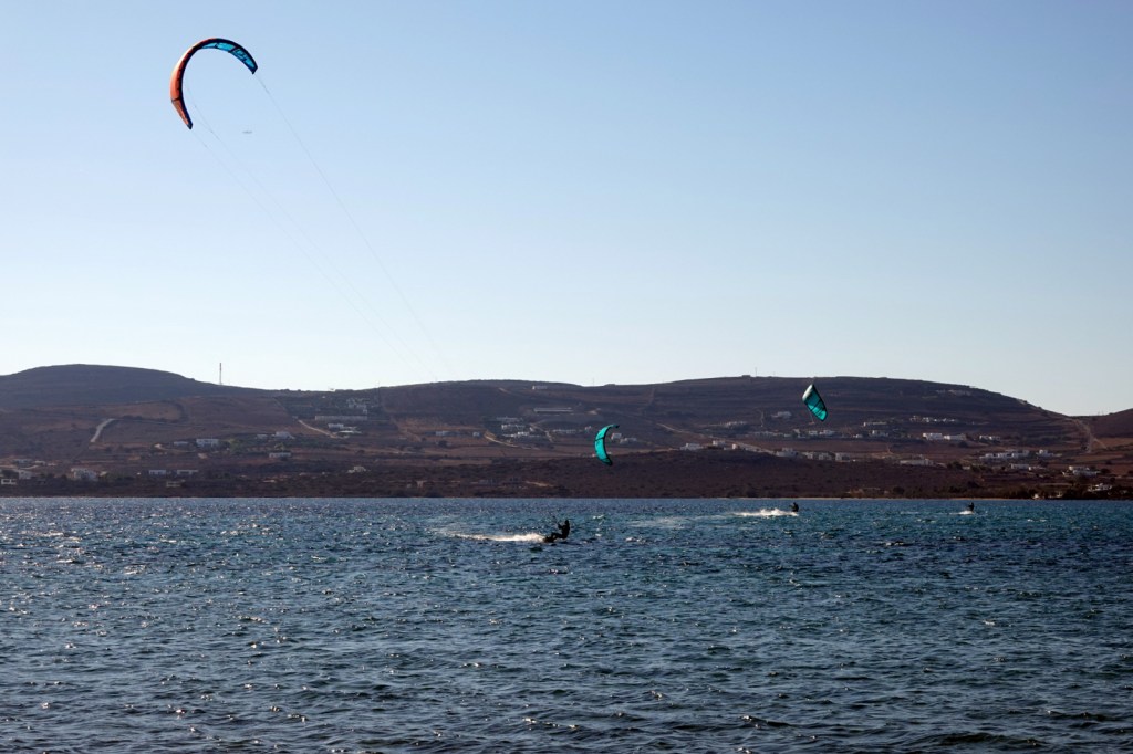 Au retour sur l’île de Paros, attiré par une danse de couleurs, nous nous dirigeons vers la plage Paros Kite Beach reconnu pour son Kite surfing. Il faut cependant se méfier lorsque nous sommes près de la plage pour ne pas recevoir une toile de kite par la tête.