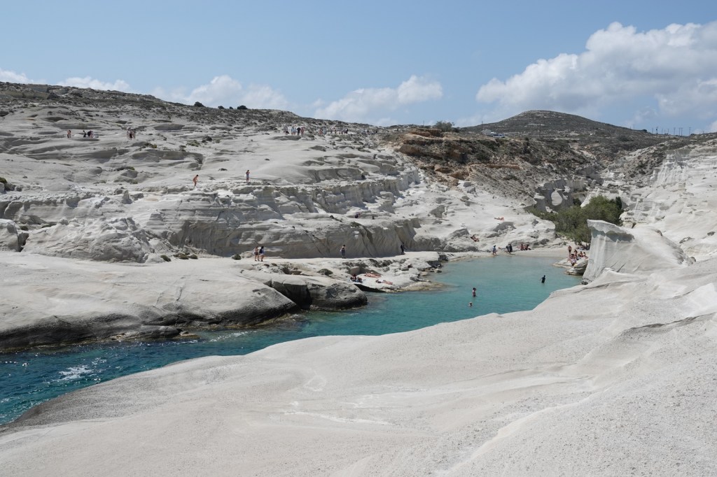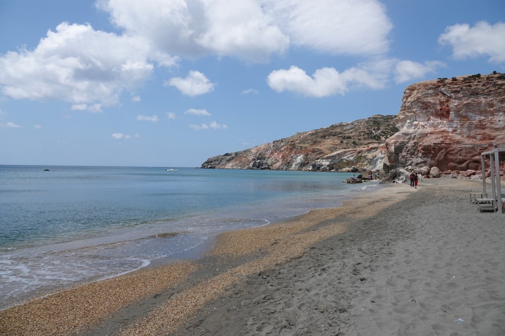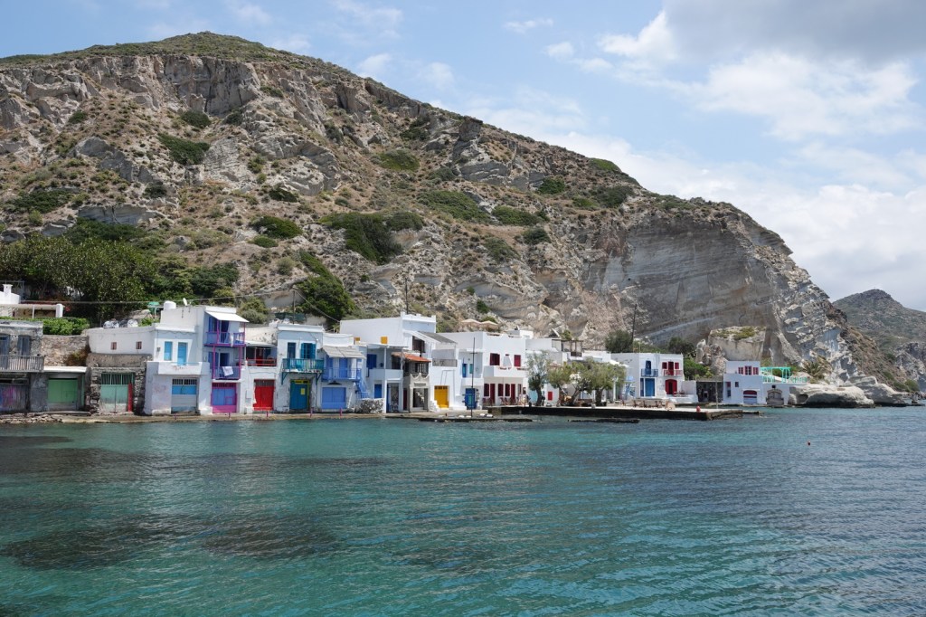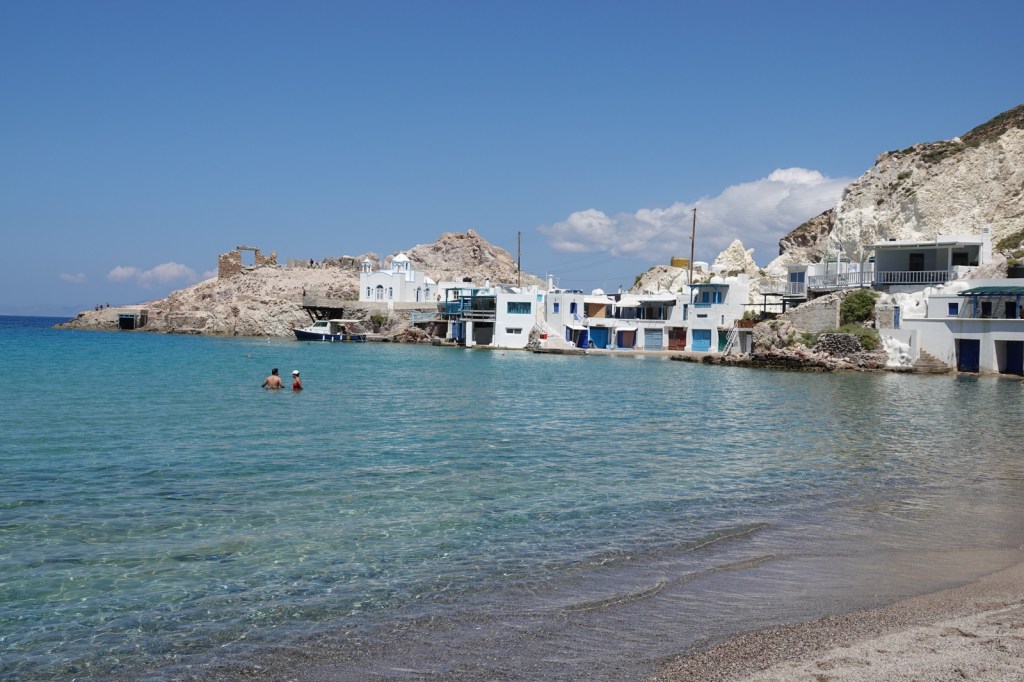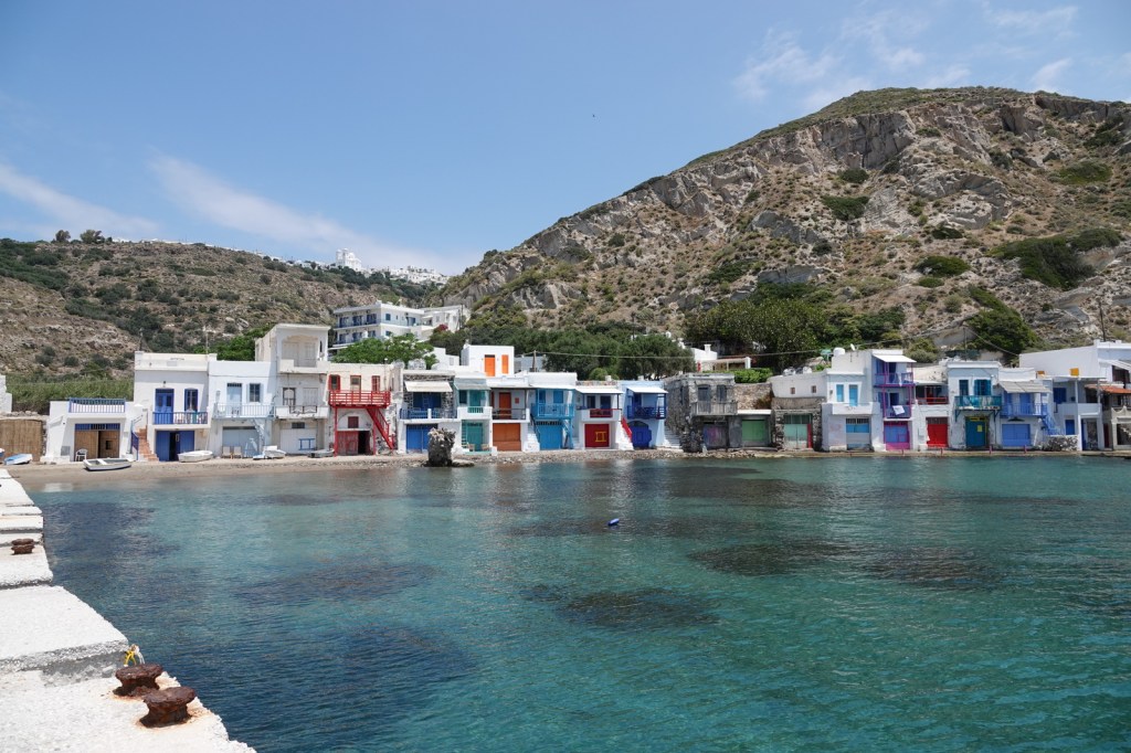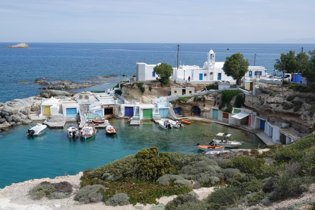 Les charmantes villes de Mandrakia et de Klima sont des trésors cachés à Milos. Leurs maisons de pêcheurs colorées, avec leurs volets bleus et leurs façades vives, créent une atmosphère pittoresque. Les bateaux de pêche colorés qui flottent sur les eaux calmes ajoutent une touche de magie à ces villages. C’est toutefois une aventure que de conduire dans les routes à une seule voie surtout quand nous rencontrons d’autres autos.