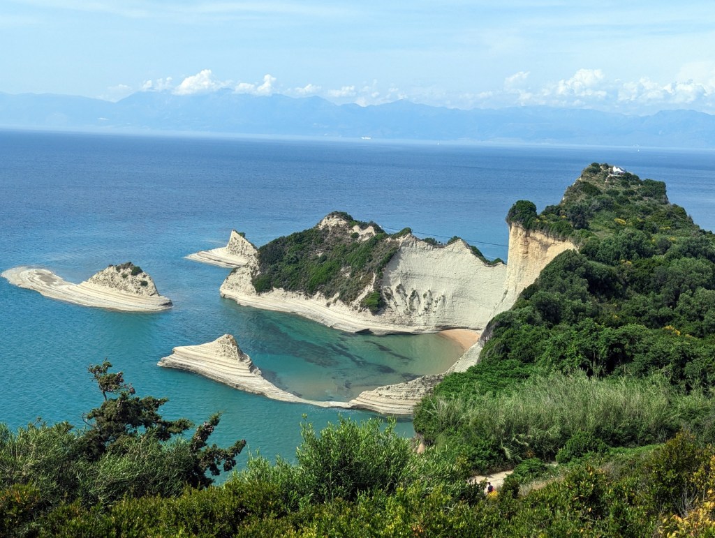 Notre journée se poursuit avec une visite à Cape Drastis, une falaise spectaculaire offrant une vue imprenable sur la mer Ionienne. Nous sommes émerveillés par la beauté naturelle qui nous entoure, avec ses formations rocheuses escarpées et ses eaux cristallines. Nous explorons les sentiers pittoresques et trouvons des points de vue époustouflants où nous pouvons contempler le panorama à perte de vue quelle récompense après une conduite à travers les chemins étroits de Corfou.