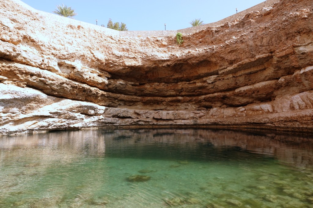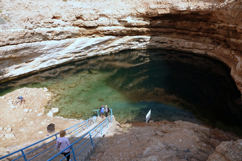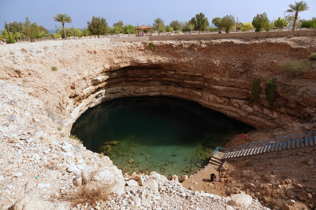 Départ de Mascate pour se rendre au gouffre de Bimmah, situé à environ une heure de route au sud-est de la capitale. C’est un grand trou de 50 mètres de diamètre et de 20 mètres de profondeur, rempli d’eau douce et turquoise. Selon une légende locale, il aurait été créé par une météorite. En réalité, il s’agit du résultat de l’érosion du sol calcaire.