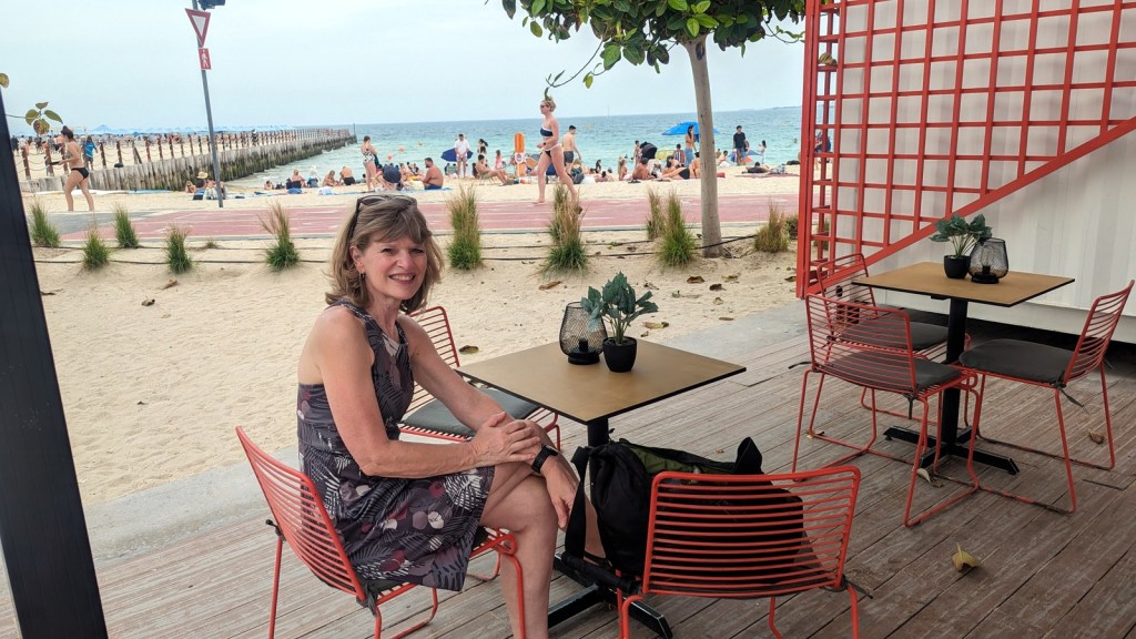 À la sortie de la cache, nous remarquons le stationnement pour les vélos Careem. Des vélos à assistance électriques que l’on peut louer. Nous pouvons faire autant de tours de 45 minutes (ou moins) dans une journée. Après avoir lu les instructions, nous voilà partie sur les pistes cyclables de Dubaï qui nous conduisent vers la plage de Kite Beach. C’est une plage animée qui ravie les gens de tout âge. Pourquoi ne pas en profiter pour un dernier repas sur une terrasse.