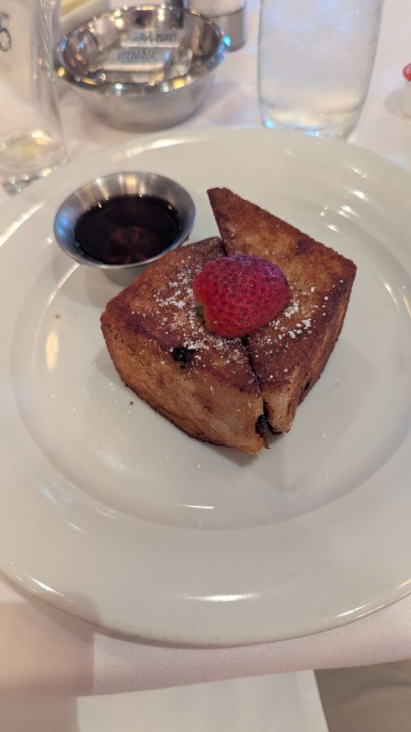 Des toasts dorées (canelle et raisin) format croisière (entre vous et moi, ce n’est pas du vrai sirop d’érable).Présentation sur l’Irlande, la salle de spectacle est assez pleine.Des vagues sont venus frapper le sixième pont, tout le monde a sursauté.Nous sommes prêts pour le repasUn spectacle digne des restaurants japonais.Le spectacle de ce soir, jusqu’à maintenant les spectacles sont vraiment bons.