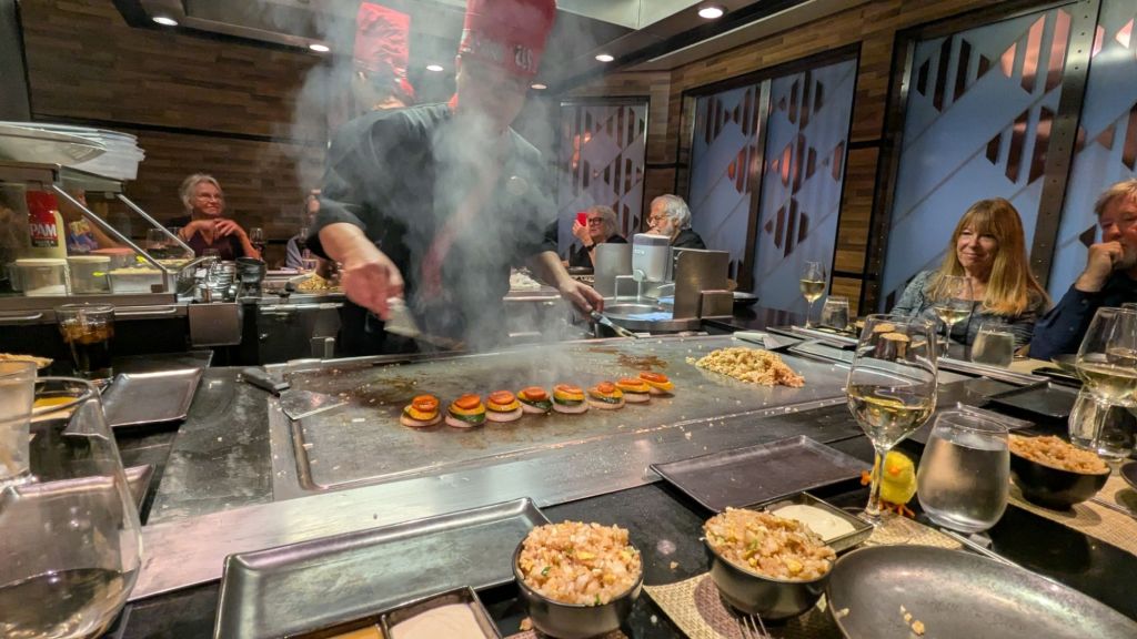 En soirée, réservation dans un restaurant de spécialité japonaise. Surprise totale : nous étions assis avec les parents d’un ami de notre fille ! Le monde est petit… même en plein Atlantique. Entre les couteaux virevoltants du chef et les éclats de rire, ce fut un vrai dîner-spectacle.
