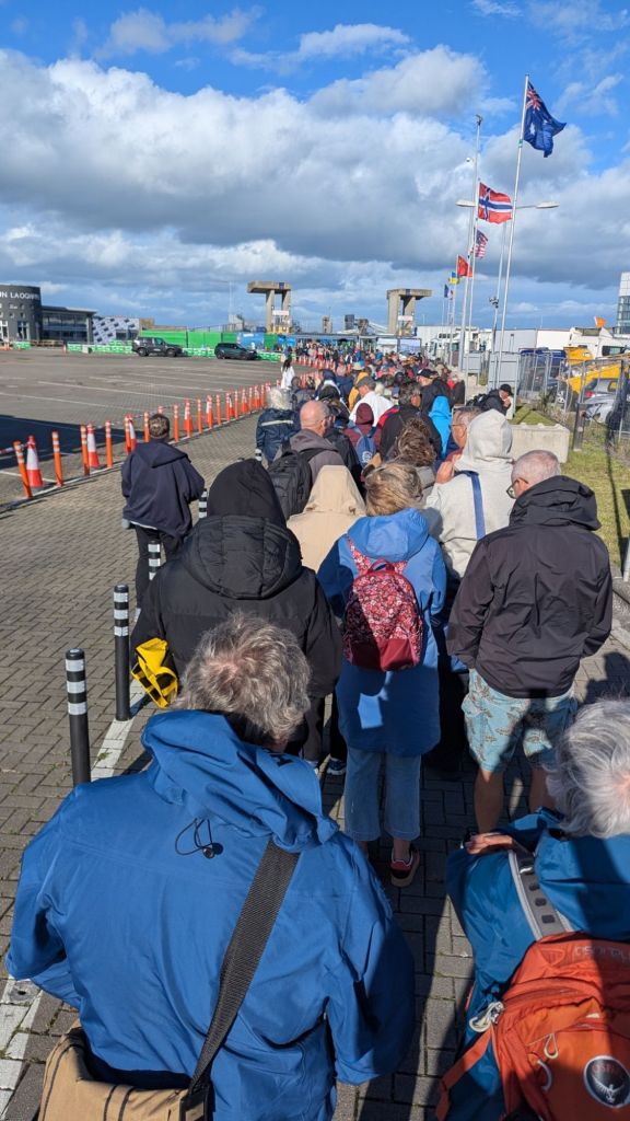 Le retour, en revanche, se transforme en véritable épopée. Arrivés à 16 h 50, une longue file nous attend pour la navette. Mais le vent et les vagues décident de jouer les trouble-fêtes. Résultat : quatre heures d’attente dans la file, à patienter pour notre tour. Heureusement, l’ambiance reste conviviale : blagues, anecdotes et solidarité entre croisiéristes. Malgré la température qui chutait, la pluie, elle, a eu la politesse de rester sage.