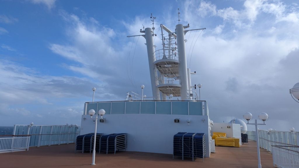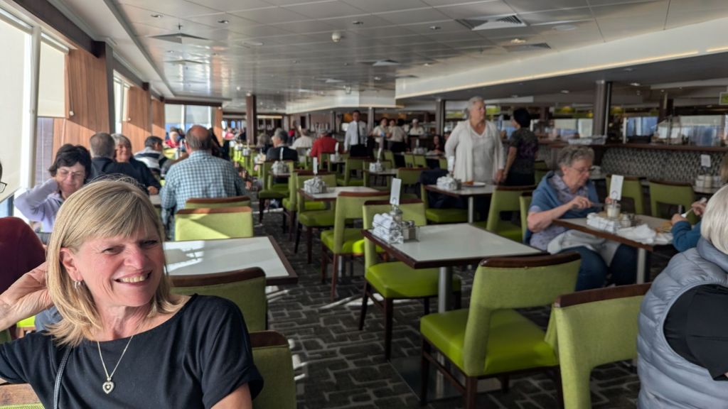 Aujourd’hui, c’est une journée au ralenti. Pas seulement pour nous, mais pour le navire lui-même, qui semble avancer comme s’il avait mangé un buffet de trop. La météo n’aide pas : ponts fermés (le 6ᵉ), balcons interdits, hublots condamnés… Bref, on est cloîtrés à l’intérieur. On se croirait presque dans un sous-marin de luxe.
