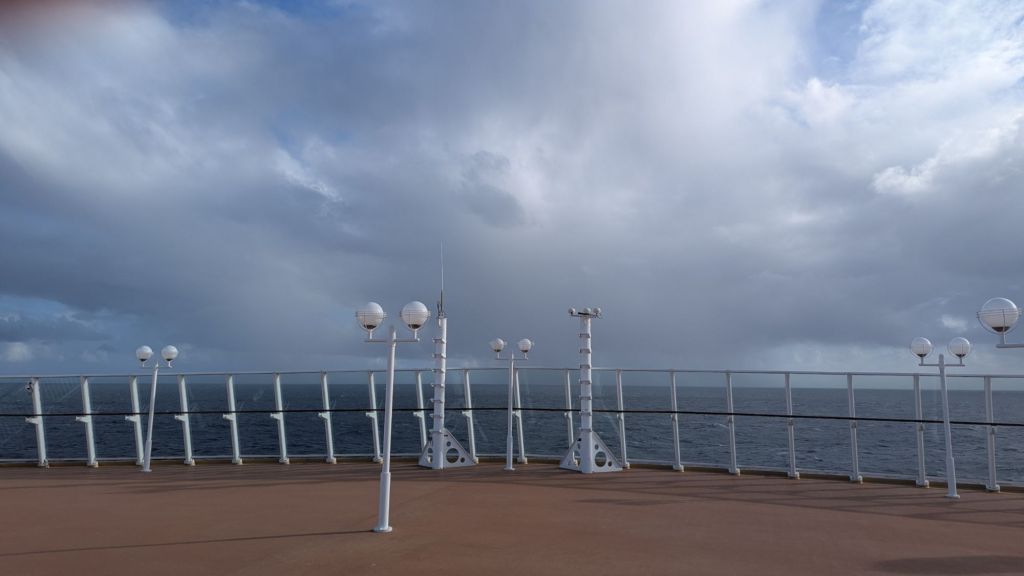 Aujourd’hui, c’était censé être Cobh, Irlande… mais l’escale a été annulée. Notre navire n’a pris la mer qu’à 2 h du matin (sans doute que le capitaine attendait que la mer se calme et que tous soient à bord). Résultat : encore une journée à voguer au gré du vent.