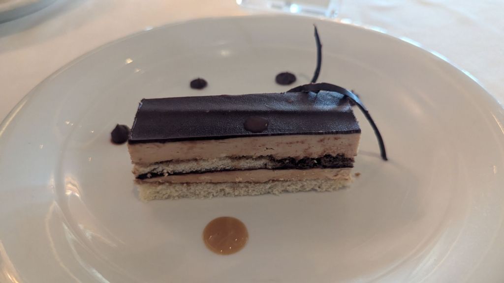 Le Soleil se pointe le bout du nez ce matin.La salle du buffet est souvent pleine à l’heure des repas.Un gateau-opéra, une première pour nous durant ce voyage.Ce soir, la mer ne nous semble pas plus calme.Le spectacle de la soirée. En fait, 2 spectacles un à 19h00 l’autre à 21h00.