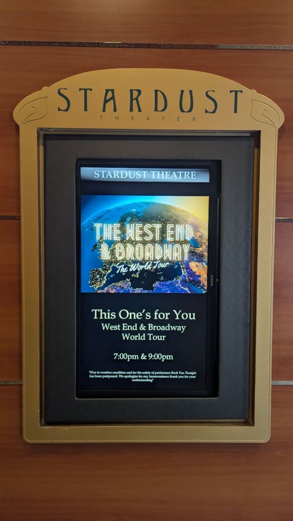 Ce soir, le programme est plus calme : un spectacle de chants est à l’affiche. Parfait pour digérer le souper et se reposer, car demain, une nouvelle escale nous attend — et cette fois, espérons qu’elle ne joue pas à la cachette avec nous!