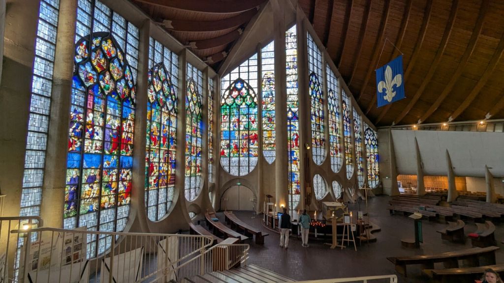 L’église Saint-Joseph, par exemple, ressemble de loin à un phare en béton. À l’intérieur, ses vitraux colorés transforment la lumière en un kaléidoscope géant.