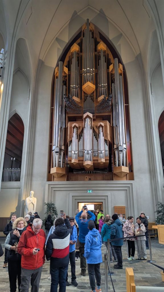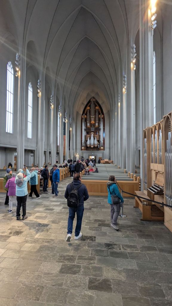 Le clou de la visite, c’est évidemment l’église Hallgrímskirkja, cette tour futuriste qui domine Reykjavik. Pas de chance : une messe avait lieu et l’église était fermée de 10 h 30 à 12 h 30. Nous en avons profité pour flâner dans les rues, admirer les maisons colorées… et surtout nous faire décoiffer par le fameux vent islandais. Le thermomètre indiquait 10 °C, mais avec le facteur vent, on se serait crus en plein hiver québécois sans nos tuques ni nos mitaines.